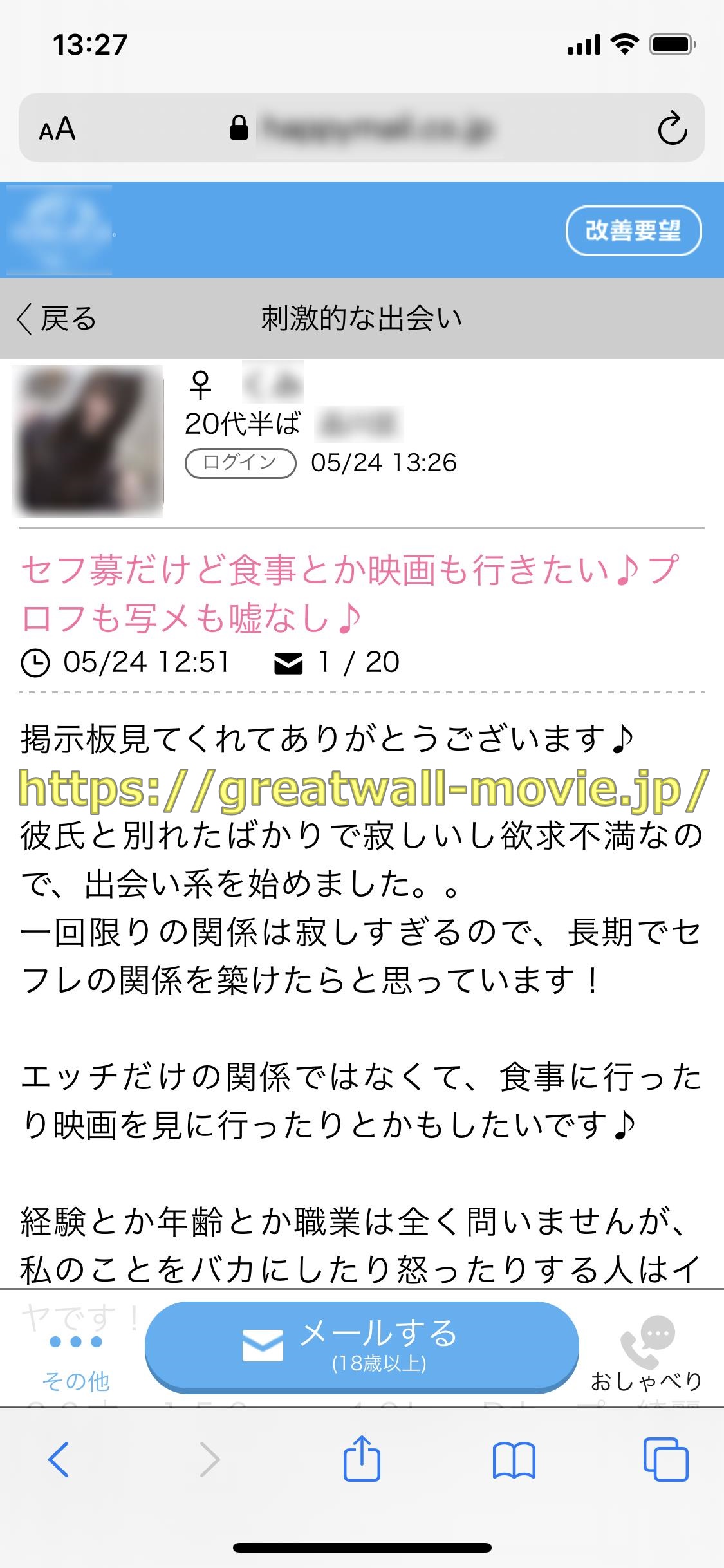 今回もいつものワンパターンで小郡市への出張中の仕事の移動中に、それとなくバンバン会える人気の出会い系マッチングサイトハピメのスマホアプリで、チャンス大人の掲示板の【アダルト女性募集】の部門の書き込みを見ていると、