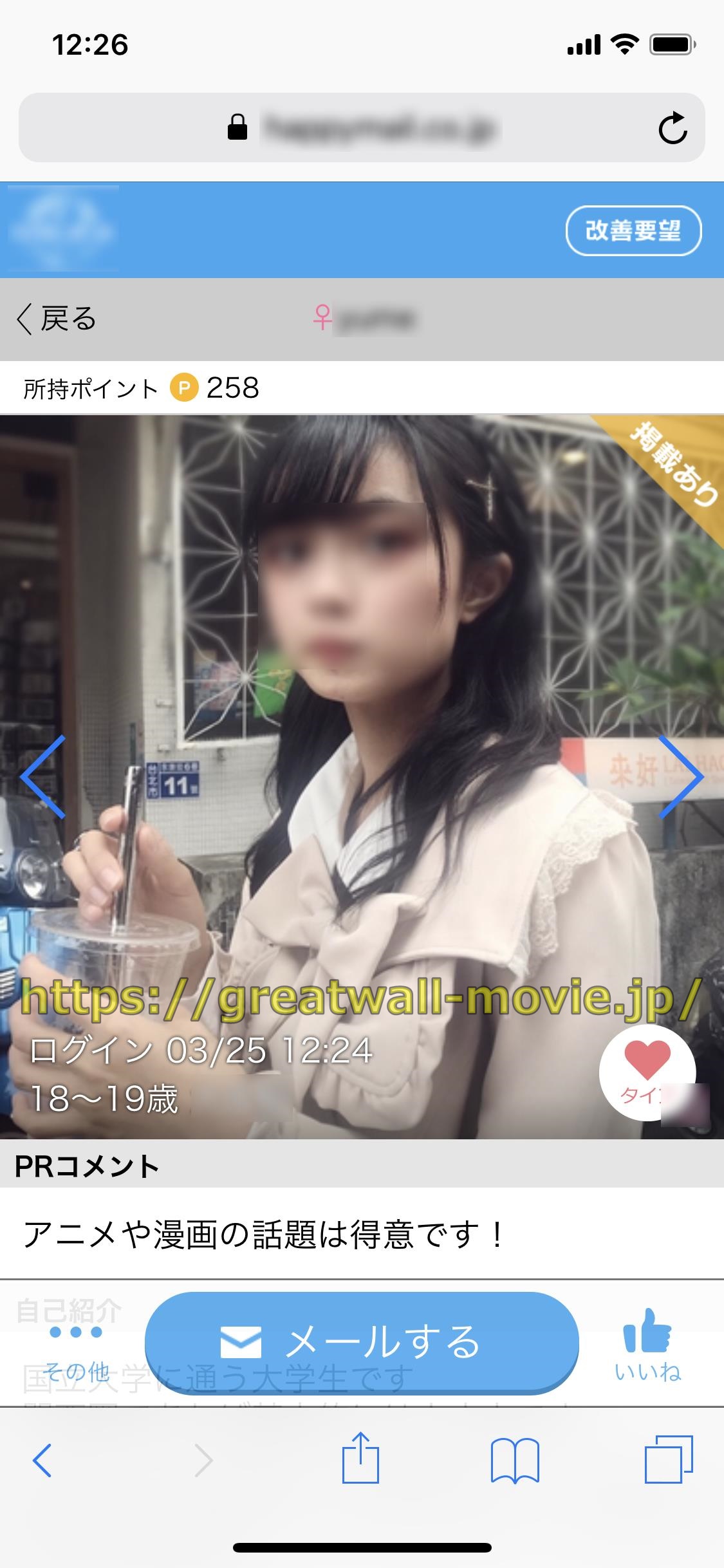 この女性の出会い系マッチングサイトミントC!Jメールでの登録地域を見ると三田市で、プロフは、